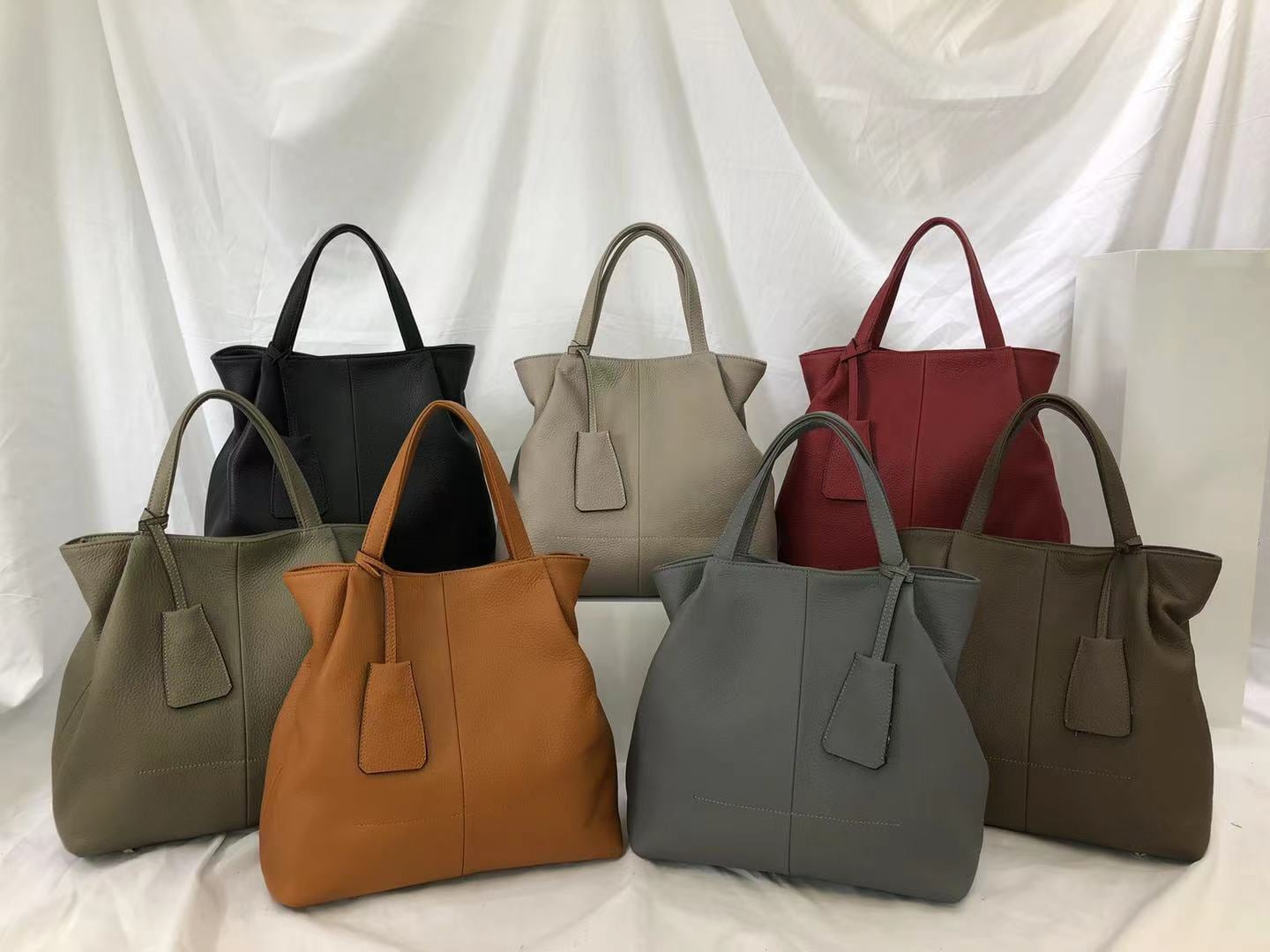 カラーはキャメル、ブラック、レッド、カーキ、ブラウン、ベージュ、ブルーグレーの7種類です。サイズは高さ29cm x 幅33cm x マチ14cmです。